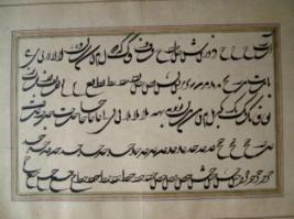 | Description / विवरण | This hand written epithet is written by Sayed Mirja in Persian language. It is written in golden colour ink on blue colour Background. It has a lining border with a floral decoration. |