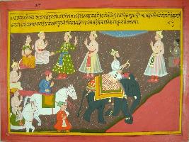 | Description / विवरण | Miniature painting based on Mahabharat - Udyam parva depicting Duryodhan did not listen to his parents words and insult them, then Bhishma tells them that today is the good day to take the army to Kurukshetra, then they made Bhishma as senapati and ask him to proceed Kurukshetra. |