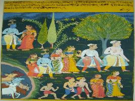 | Description / विवरण | Miniature painting based on Rasikpriya. It is raining and getting dark, therefore everyone is going back to their houses. Krishna is getting sad due to the separation with Radha. |