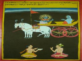 | Description / विवरण | Miniature painting based on Shri Bhagwat Gita. It depicts Krishna preaching Arjun that for doing all right thing you have five reasons. I am telling you those, listen carefully. |