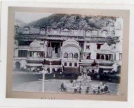 | Description / विवरण | This is the photograph of Dorbar hill of city palace, the Raj Mahal. Stairs approaches it from open pavilion containing an octagonal fountain in them. Hill is visible is background. |