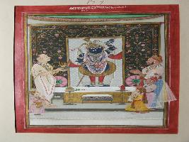 | Description / विवरण | It is a painting of Srinathji. A worshipper is shown in worshipping posture right side . Followers are visible on left side. Srinathji is written at top. |