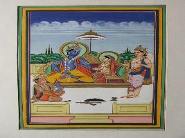 | Description / विवरण | It is a painting of Lord Rama and Janaki Sita . Laxman is shown beside Janaki. Hanuman is sitting near feet of Lord Rama. Shield and sword is shown. Top upper is shown blue sky. Plants had also shown back portion of Lord Rama. |