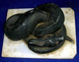 | Description / विवरण | Crested snake in a coiled form, in black colour, made of stone. |
