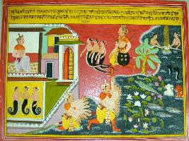 | Description / विवरण | Miniature painting based on Harivansha depicting Sahastrajuna moving behind the son of Kotnag to catch him and entered in sea behind him. |