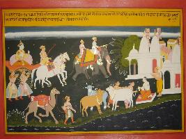 | Description / विवरण | Miniature painting based on Mahabharat - Gada parva depicting Balram is going to Peli Prabhas tirtha. Chandra king got killed in war. |