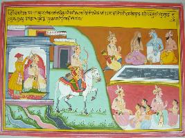 | Description / विवरण | Miniature painting based on Harivansha depicting Raja Kunupriya sitting in the right side of the painting. He is seen riding a horse and meet three sages. In the lower part he is sitting with his four sons-Ghanuwa, Sughantu, Parishat and Subahu. |