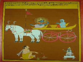 | Description / विवरण | Miniature painting based on Shri Bhagwat Gita. It depicts Krishna preaching Arjun that don t do any bad to a person, don t be selfish, and do all your earthly work wisely then you are learned person. |