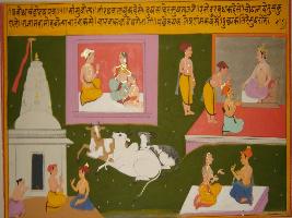 | Description / विवरण | Miniature painting based on Sanskrit drama - Prabodh Chandrodaya depicting the disciple of Charvak telling that Tirthvalayu said, with sadness the happiness arises. At the upper left king Mahamoha is meeting Charvak and Kali also offering namaskar to him. |