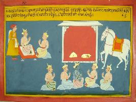 | Description / विवरण | Miniature painting based on Mahabharat - Udyam parva depicting Dhritarastra is telling Duryodhan not to go for war as he is doing adharma . This painting also depicts all Pandavas are discussing that Duryodhan did not listen to Bhishma, Dronacharya and Dhritrashtra. |