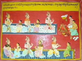 | Description / विवरण | Miniature painting based on Harivansha depicting genealogical decendancy of king Resut . In lower part he is depicted talking of Indra. In top left parts, two sages are depicted performing yagna. |