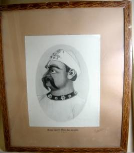 | Description / विवरण | Glass framed black and white photo print of Thakur Churamani- the founder of Bharatpur state who ruled upto 1718 A.D. He is facing right, has moustaches and wearing a turban. |