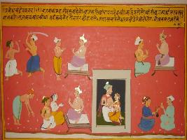 | Description / विवरण | Miniature painting based on Sanskrit drama - Prabodh Chandrodaya depicting Charvak telling Mahamoha about the emergence of Kali and the elimination of the way of Veda and dharma. |