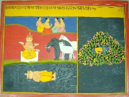 | Description / विवरण | Miniature painting based on Harivansha depicting miracle of Lord Brahma. He is seated on river bank and an elephant, a cow and a horse are standing near him. He is also shown lying in the river. In the left part, Krishna is depicted lying on a pile of leaves. |