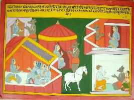 | Description / विवरण | Miniature painting based on Harivansha depicting the scene of army camp of Pandavas, sitting together in the lower right corner. A demon is talking to three of them individually. In the lower left corner, Narad is visiting the demon and his wife. |