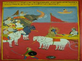 | Description / विवरण | Miniature painting based on Shri Bhagwat Gita. It depicts that Krishna asking Arjun to get up, leave the weakness and get prepared for battle. |