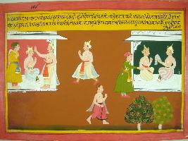 | Description / विवरण | Miniature painting based on Mahabharat - Udyam parva depicting Dhitrashtra is telling Duryodhan that legally the successor of his throne after him is Yudhisthir only not Duryodhan. |