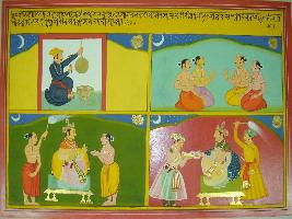 | Description / विवरण | Miniature painting based on Harivansha. This painting is divided into four parts, on one part a man is ringing a bell, four men talking in another, on the lower part king Indra is talking to a priest and in one part a man is offering a flower garland to a seated king. |