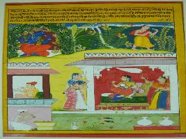 | Description / विवरण | Miniature painting based on Rasikpriya. On the upper part Krishna is depicted sitting in Vrindavan with love for Radha in his heart. Even the gods are admiring his love. On the lower part Radha is depicted sitting on a throne with two attendants in a palace. |