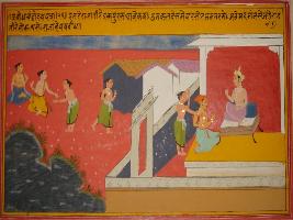 | Description / विवरण | Miniature painting based on Sanskrit drama - Prabodh Chandrodaya depicting of Parshot city seated at the left side. A messenger of two men, goes and is shown giving a letter to the king. |