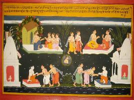 | Description / विवरण | Miniature painting based on Mahabharat - Gada parva depicting Vaishpayan rishi istelling Raja parikshit about tirtha undertook by Baldaeva. Balram after taking bath and giving dana, went to Udpana tirtha. This is story related to this tirtha which is depicted in painting. Atri rishi left his brother in anger Pariskshit asked Vaishpayan reason of his anger. Then Vaishpayan narrated the story that one rishi has three son. All three loved each other and worship together. |