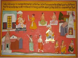 | Description / विवरण | Miniature painting based on Sanskrit drama - Prabodh Chandrodaya depicting minister of king reading out a letter to him, two sages talking, houses with a temple of Vishnu at the upper part. At the lower part, houses and a Shiv temple, Kamdev walking with Adharam and defeated by Devi Santi, a king sitting on throne and Devi Sardama sitting with two females are depicted. |
