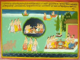 | Description / विवरण | Miniature painting based on Mahabharat - Gada parva depicting Trata with his two brothers decided to do yagna and after performing yagna move towards east. One the way one of them fall in Chitrakupa. Then rest two brothers performed yagna in Chitrakupa and get back their brother. |