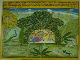 | Description / विवरण | Miniature painting based on Rasikpriya. It is the depiction of a scene from Vrindavan. Radha is sitting and waiting for Krishna under the moonlight sky and surrounded by monkeys, peacocks and deers. |
