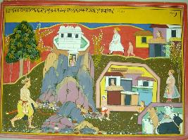 | Description / विवरण | Miniature painting based on Harivansha. On the upper part a man followed by a child, a woman watching them from the house are depicted. On the lower side a king is beating his bow on rocks and a man is visiting a village, five bulls are depicted sitting. |