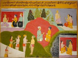 | Description / विवरण | Miniature painting based on Sanskrit drama - Prabodh Chandrodaya depicting a king talking to his two soldiers at the upper right part. Two noble men talking each other in the centre. A woman is talking to a man at the lower right side. A king is seated with two Pundits in the upper left part. |