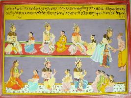 | Description / विवरण | Miniature painting based on Harivansha depicting Genealogical order. In the upper row three kings are sitting with their sons. In the lower right row, a queen with a child and two kings with one and four children. In the left part a king is giving her daughter to a sage. |