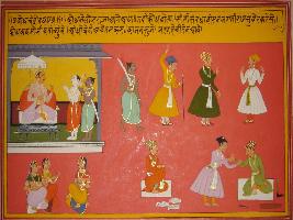 | Description / विवरण | Miniature painting based on Sanskrit drama - Prabodh Chandrodaya depicting, Krodh anger and Lobha greed standing in front of a king on the right upper corner of the painting. Painting tells about the influence of these two evils on men. |