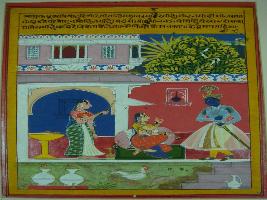 | Description / विवरण | Miniature painting based on Rasikpriya depicting the immense love of Radha and Krishna for each other. Krishna and Radha, seated on a couch, are having a conversation. A female chauri bearer is seen with Radha. |