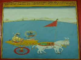 | Description / विवरण | Miniature painting based on Shri Bhagwat Gita. It depict, Sanjay told Dhritrashtra that Arjun is telling Krishna that he will not fight in the war. |