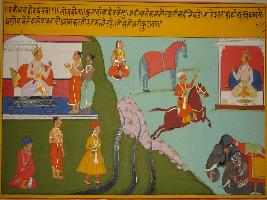 | Description / विवरण | Miniature painting based on Sanskrit drama - Prabodh Chandrodaya depicting Krodh and Lobha standing in front of a king on the right upper corner of the painting, below them three men are seen, in the centre three small riverlets are depicted. On its left horse and elephants are seen and on the top left a seated woman, a horse rider and a seated king are depicted. |