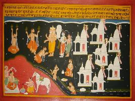 | Description / विवरण | Miniature painting based on Mahabharat - Gada parva depicting Kuru king performing a yagna which is conducted by Udhalaka rishi. Saraswati comes to this yagna. There is one rishi named Makaranak rishi who is also coming for this yagna. He saw a woman while taking bath. This led to birth of seven Shiv temple. The paing also depicts small plants started growing from the hands of Kanaka rishi. |
