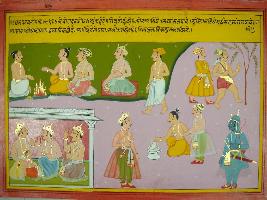 | Description / विवरण | Miniature painting based on Mahabharat - Udyam parva depicting Drona is telling Duryodhan that a person who is mitradrohi or commite sin during yagna does not get respect in the court. A good person is he who worship Shiv and does good deed. |