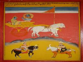 | Description / विवरण | Miniature painting based on Shri Bhagwat Gita. It depicts Krishna preaching Arjun that in the middle of two armies live sorrow. |