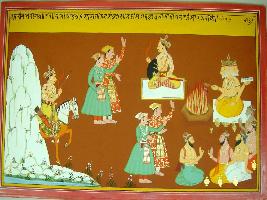 | Description / विवरण | Miniature painting based on Harivansha, on the left side a king seated on horse with a bow and arrow is shown. In the middle part he is sitting and two standing men are talking to him. Those two men are again depicted talking about Brahma performing yagna along with four sages. |