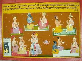 | Description / विवरण | Miniature painting based on Mahabharat - Udyam parva depicting Bhishma and Drona are trying to convince Duryodhan not to fight the war and says that he cannot defeat the hero like Arjun who is a great warrior and great archer and gives respect to Brahmans. |
