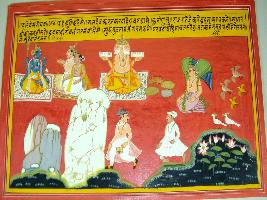 | Description / विवरण | Miniature painting based on Harivansha depicting Indra, Brahma and Garuda sitting and requesting Lord Vishnu to take birth on the earth. In the lower part, two men, birds, water pond full of lotus blooms and hills are depicted. |