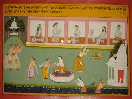 | Description / विवरण | Miniature painting based on Mahabharat - Gada parva depicting Jandhodar sage performing penance and taking holy dep in river Saraswati. Later Baldev came of dip and sacrifice, and touches feet of sage. |