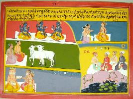 | Description / विवरण | Miniature painting based on Harivansha depicting at the lower left, four men sitting on the rock and discussing. At the lower right, Brahma is shown with Indra and another sage. Above this, two sages is sitting in front of cows and at the top, Lord Vishnu is depicted in seated position. At the upper left, king Indra is shown sitting in front of two sages. |