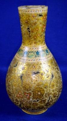 | Description / विवरण | Surahi water container having vertical rim, long narrow neck, bulbous body and circular base. In the outer surface floral designs and birds are painted. |