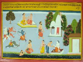 | Description / विवरण | Miniature painting based on Mahabharat - Gada parva depicting Parikshit says Vaispayana that Ram killed many demons in Kamyaka vana and a head of demon attached to the thigh of Mahodar sage who is going to bank of Saraswati and doing dhyana to get of the demon head. |