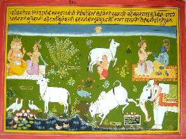 | Description / विवरण | Miniature painting based on Harivansha depicting Lord Indra sitting with Lord Brahma at the right upper corner and Indra sitting with Krishna at the left upper corner. Some cow, birds and vehicle of Indra - Airavat are also depicted. |