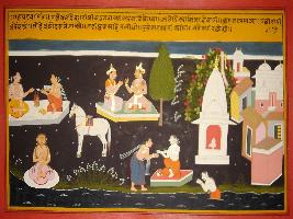 | Description / विवरण | Miniature painting based on Mahabharat - Gada parva depicting Baldev reaches to the hermitage of sage sadag. There he saw sages like Vishwamitra and Dewapi and several Brahmans. There Baldev asks them for the way to get moksha. |