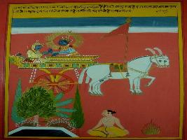 | Description / विवरण | Miniature painting based on Shri Bhagwat Gita. It depicts Krishna preaching Arjun that the person who does not generate problems for others and for whom the happiness and sadness are equal will attain moksha. |