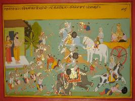 | Description / विवरण | Miniature painting based on Mahabharat - Gada parva. It depicts hermitage of sage Vashist and on army fighting with Bheel s army in front of hermitage. |