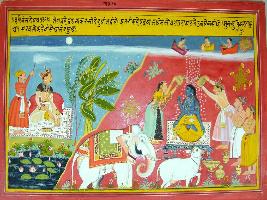 | Description / विवरण | Miniature painting based on Harivansha depicting Lord Vishnu in centre, a female and Indra pouring water on him. Two sages are standing besides them with folded hands. Below them, Airavat and Kamdhenu are depicted. On right end, a king is depicted on Asana and a chauri bearer is standing behind him. Gods are pouring flowers on Vishnu from sky. |